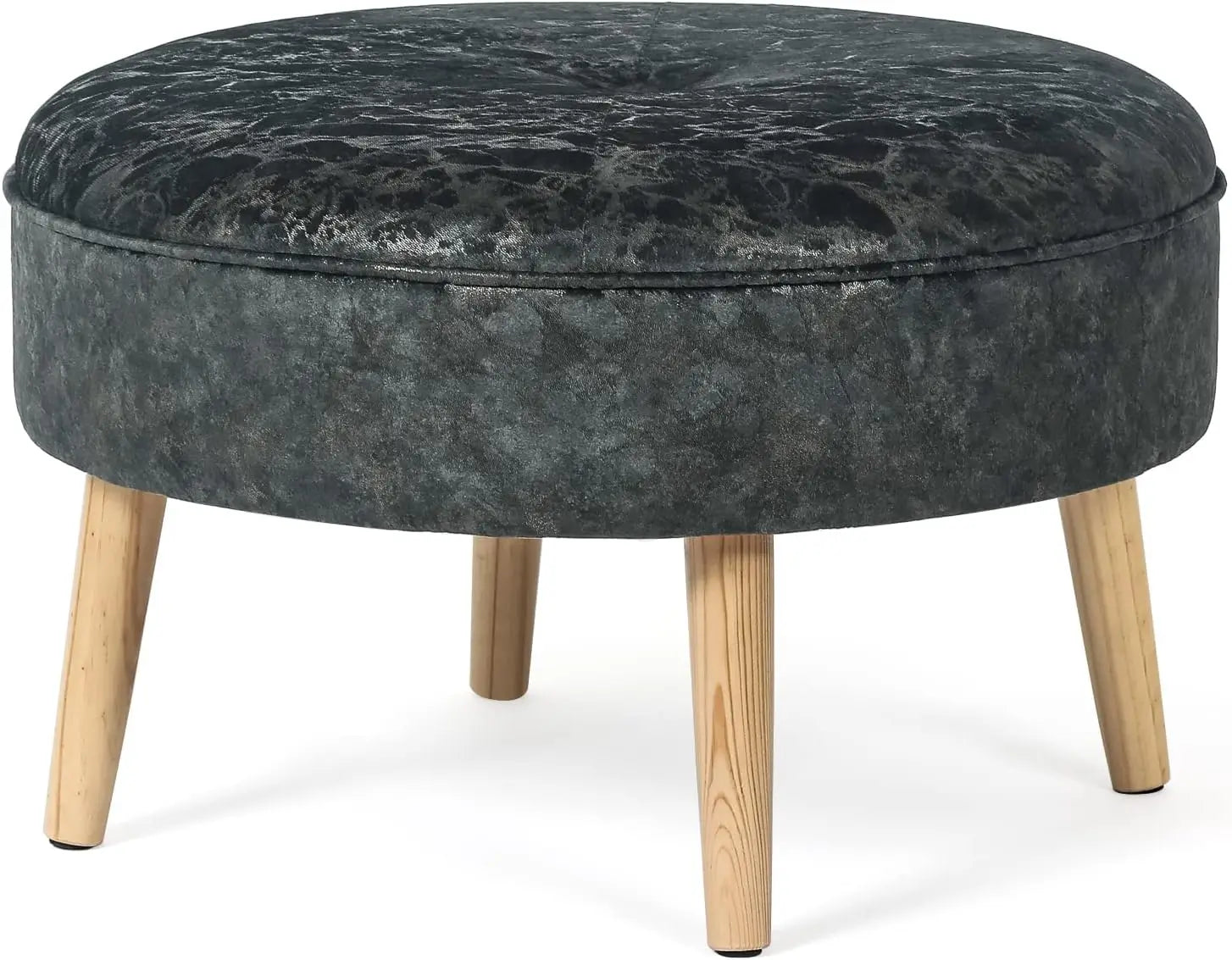 23" Round Velvet Footrest Stool, Upholstered Ottoman Coffee Table, Button Tufted Padded Foot Stools with Solid Wood Legs