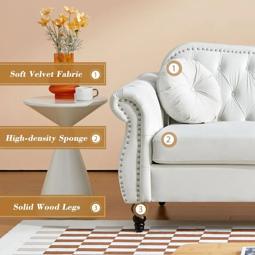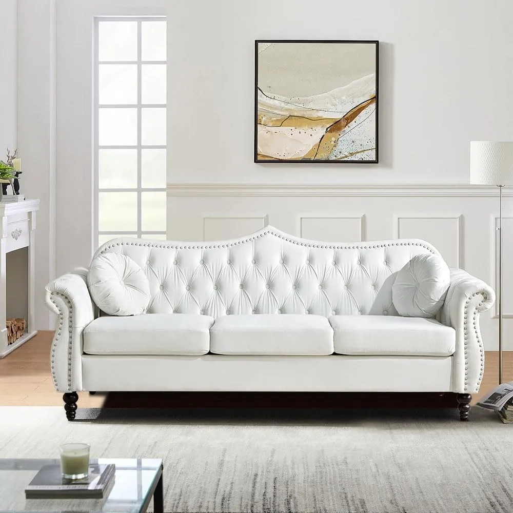 - 【Nailhead Trim】This 3 seater sofa doesn't skimp on decorative details. Expertly designed, this piece has a tasteful nailhead trim and adjoins the armrests. Each nailhead is applied individually and has a beautiful handcrafted touch, creating a rich and luxurious visual effect. And modern tufted velvet sofa with individual seat cushions, giving any room a refined appearance. This provides a smooth, immaculate texture for this piece as well as plush seating for extra comfort.