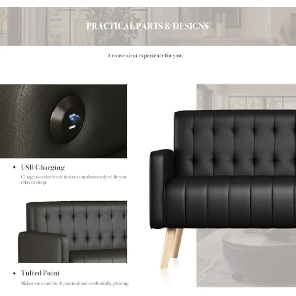 57” W Loveseat Sofa, Small Black Faux Leather Couch w/USB Charging Ports, Mid Century Modern Tufted Love Seat Couches