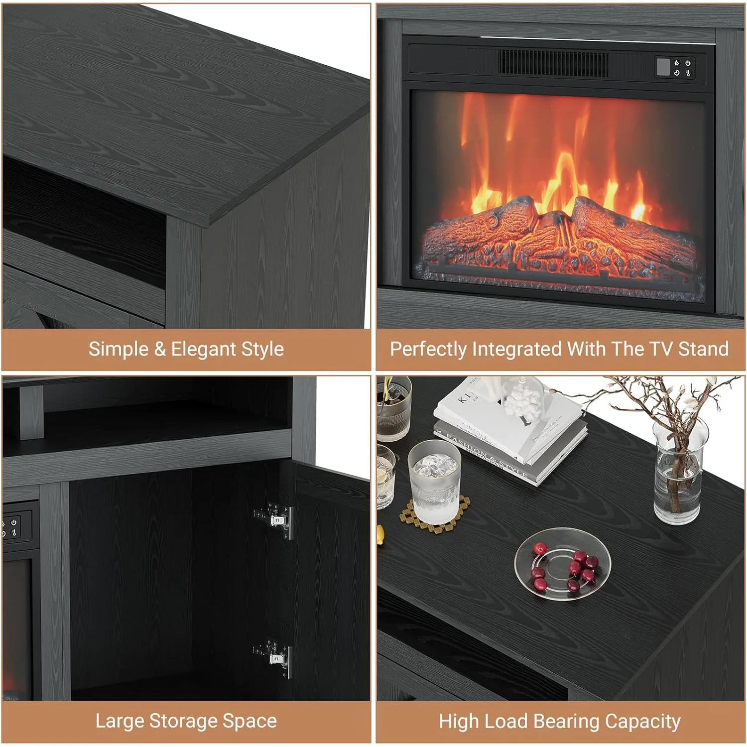🔥 MODERN DOUBLE-DOOR CABINET DESIGN: The sophisticated electric fireplace with double doors features smooth-gliding cabinet doors that conceal storage space while maintaining easy access to your media equipment. This modern grayish black fireplace TV stand showcases contemporary styling that complements various home décors from farmhouse to minimalist, making it a stunning centerpiece for any living space.
