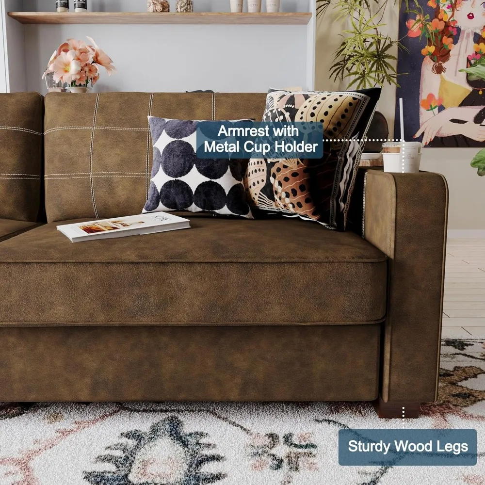 Casual Contemporary Style: This 80 inch faux leather sofa blends vintage charm with modern elegance. Wide armrests and a sleek design make it a perfect leather couch for living rooms, bedrooms, apartments, or offices Premium Faux Leather: Crafted with padded brown faux leather couch upholstery featuring a weathered hue and pebbly texture, this sofa leather offers the cool look of leather sofas with the cozy feel of fabric Fashionable Stitching: Prominent jumbo contrast stitching and a clean-lined divided back add style to this faux leather couch, making it a standout piece among leather couches for living room options Built-in Cup Holders: Convenient armrest cup holders keep drinks close at hand, adding everyday functionality to this brown leather sofa without sacrificing its modern style Deep Comfort Support: Featuring a 24.5" deep seat and 18.5" padded back pillows, this leather sofa supports your head, neck, back, and legs for a luxurious seating experience in any room Sturdy Construction: Designed with a hardwood frame, strong wood legs, and no-sag spring packs, this brown sofas for living room choice supports up to 900 lbs for long-lasting use