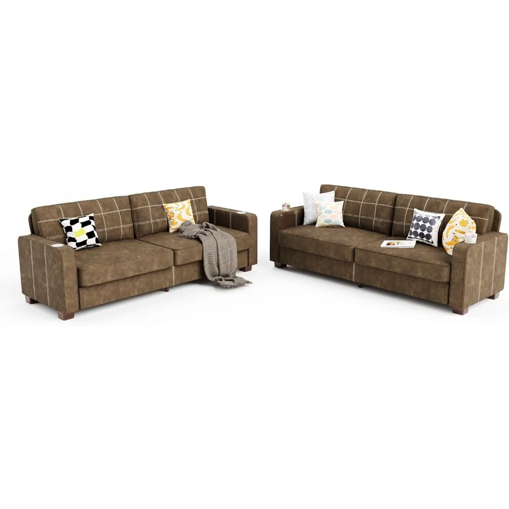 80 Inch Brown Faux Leather Sofa Couch (2 Sets) - Wide Armrests with 2 Built-in Cup Holders, Deep Seats, Contrast Stitching