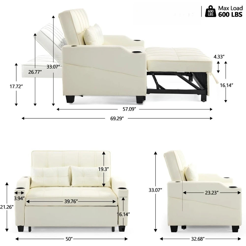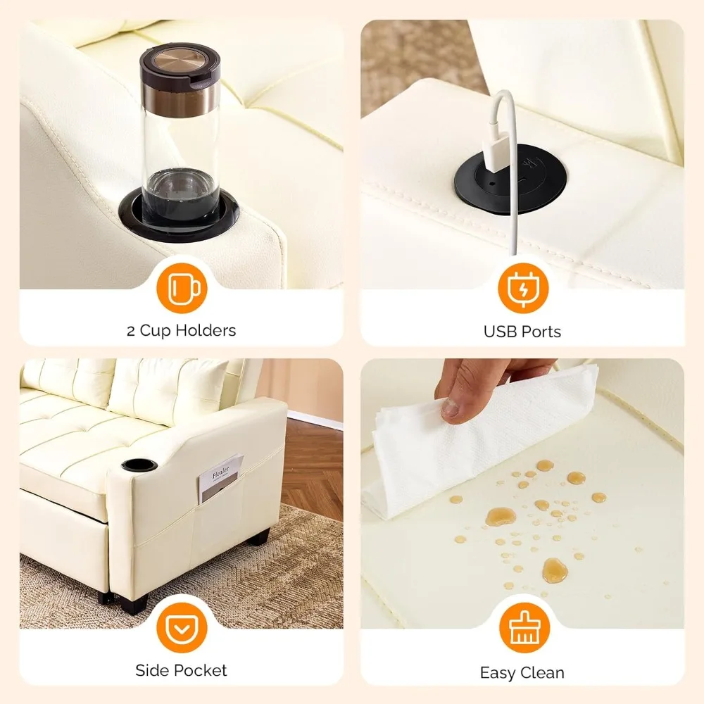 Beige Loveseat Sleeper Sofa, Convertible Futon Sofa Bed Faux Leather Pullout Couch Bed with USB Ports, Cup Holders, Armre