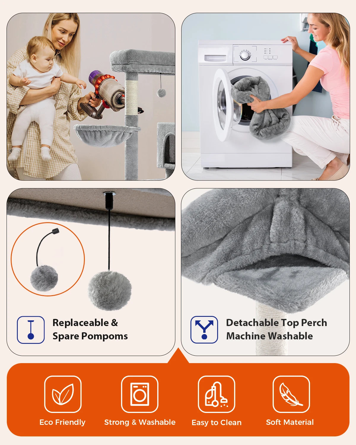 Ultimate Activity House: Equipped with a roomy condo, spacious hammock, cozy plush top perch, natural sisal covered scratching posts and fluffy dangling ball, this 56.3’’ cat tree is an ideal place for entertaining as well as taking a good rest. Your frisky kittens could easily jump up and down with the assist of the round pedal and step-like layout.