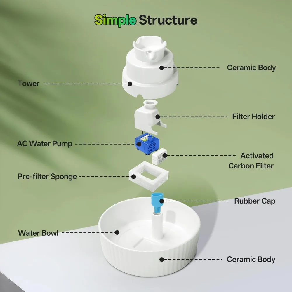 - 😽【Multi-Filtration, Water Purification】: Equipped with activated carbon filter and pre-sponge filter, which can remove sediment, debris and pet hair, this ceramic pet water dispenser can provide a constant supply of flowing purified water. Note: It is healthier to change the filter every 4 weeks!