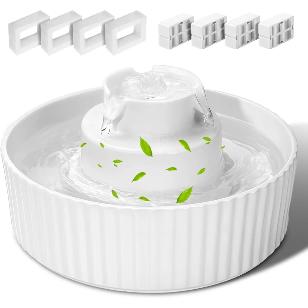 Ceramic Cat Water Fountain, 2.1L/70oz Porcelain Pet Drinking Dispenser with 4 Set Replacement Filter & Sponge, Automatic Dog Wat