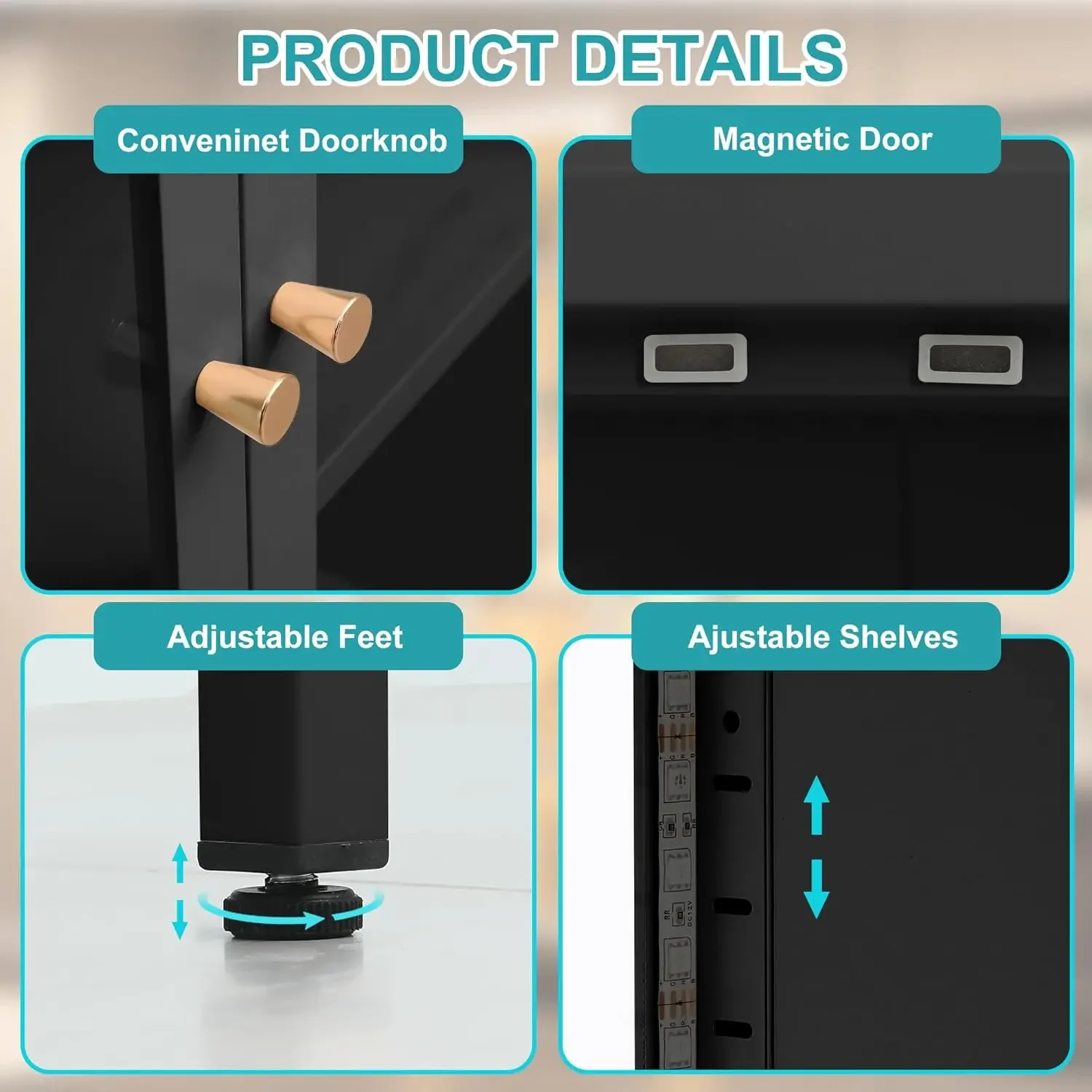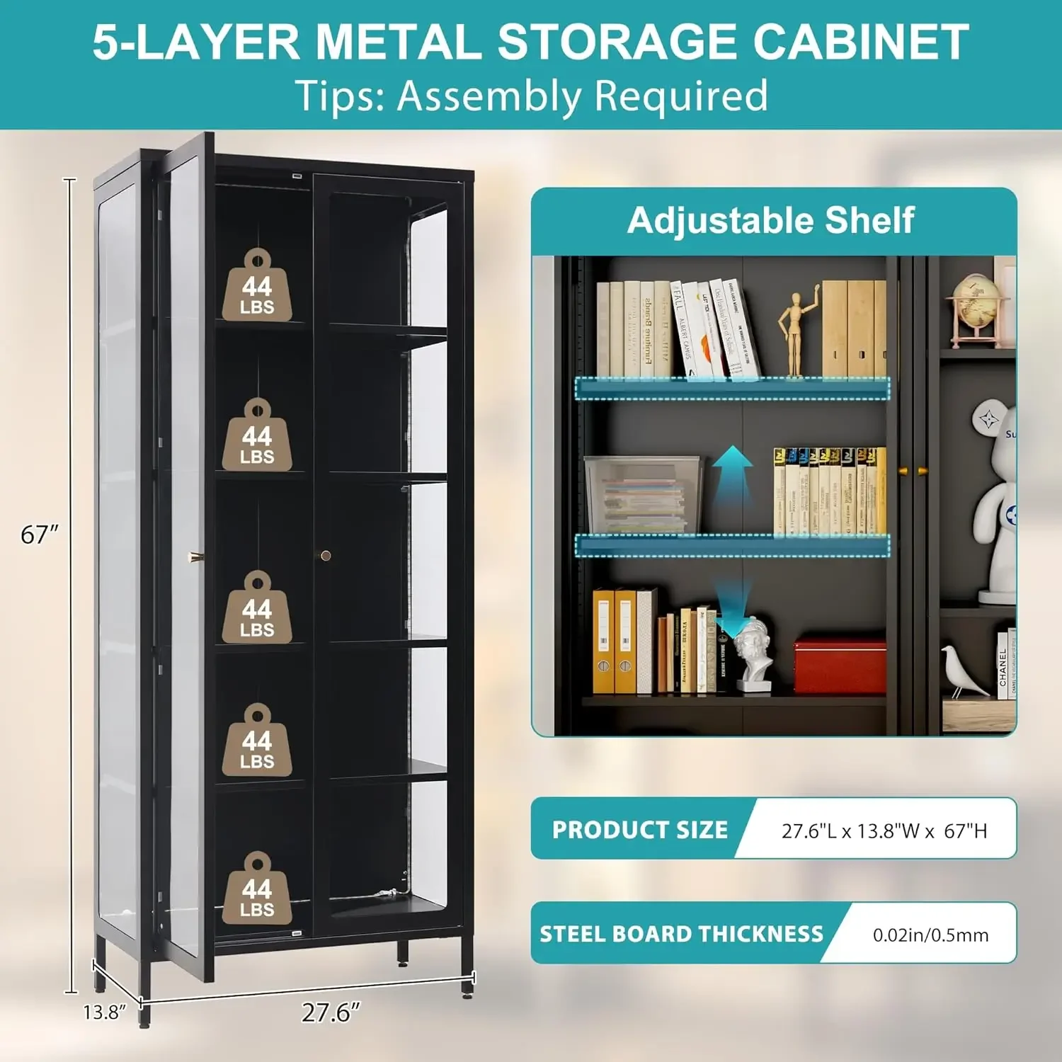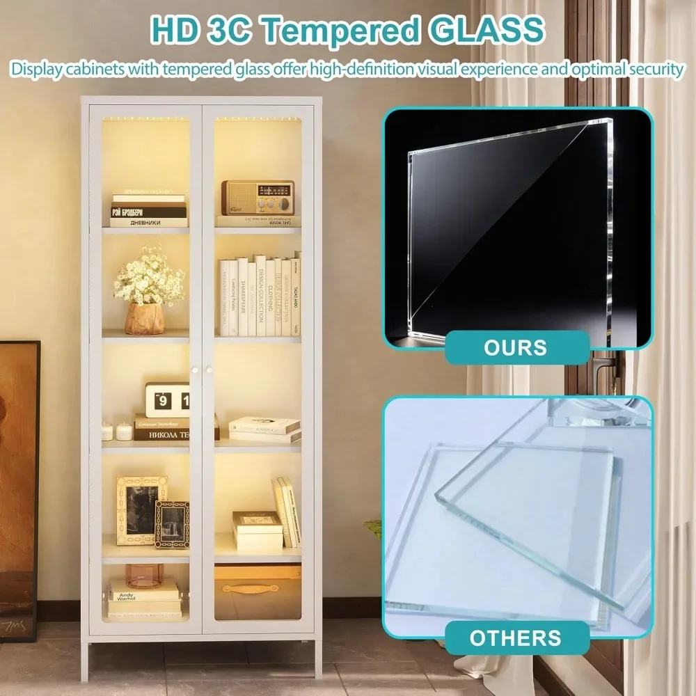 【5-Tier Design & Adjustable Shelves】Measuring 27.6"W x 13.8"D x 67"H, this 5-tier glass display cabinet with lights offers generous storage space for trophies, collectibles, books, and more. The 4 adjustable shelves can be easily customized to accommodate items of varying heights, catering to diverse display needs.