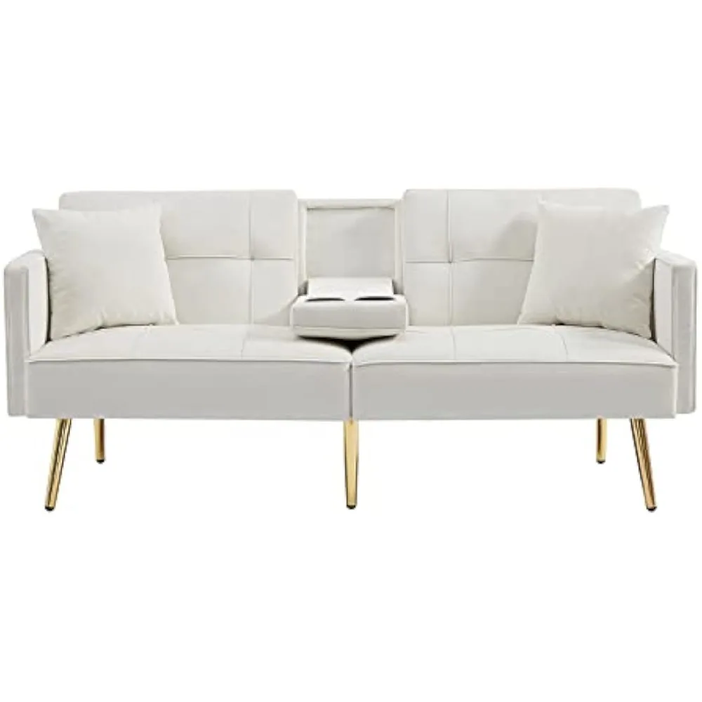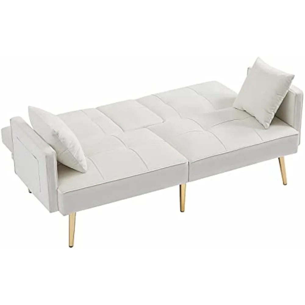Futon Sofa Bed Modern Linen Fabric Couch Bed Loveseat Convertible Daybed with 2 Cup Holders and Removable Armrests