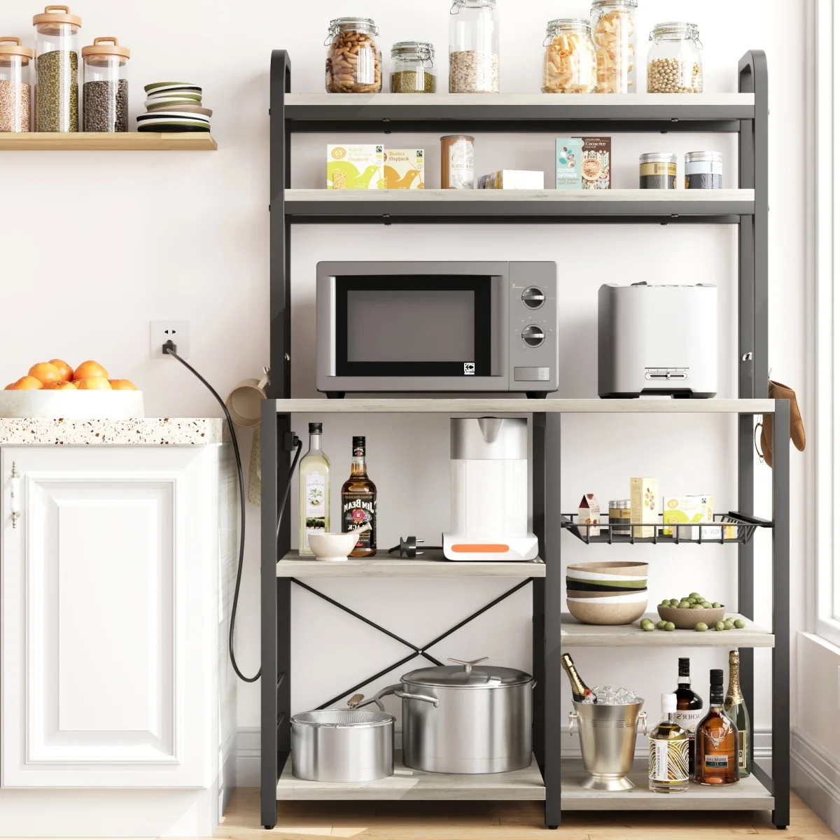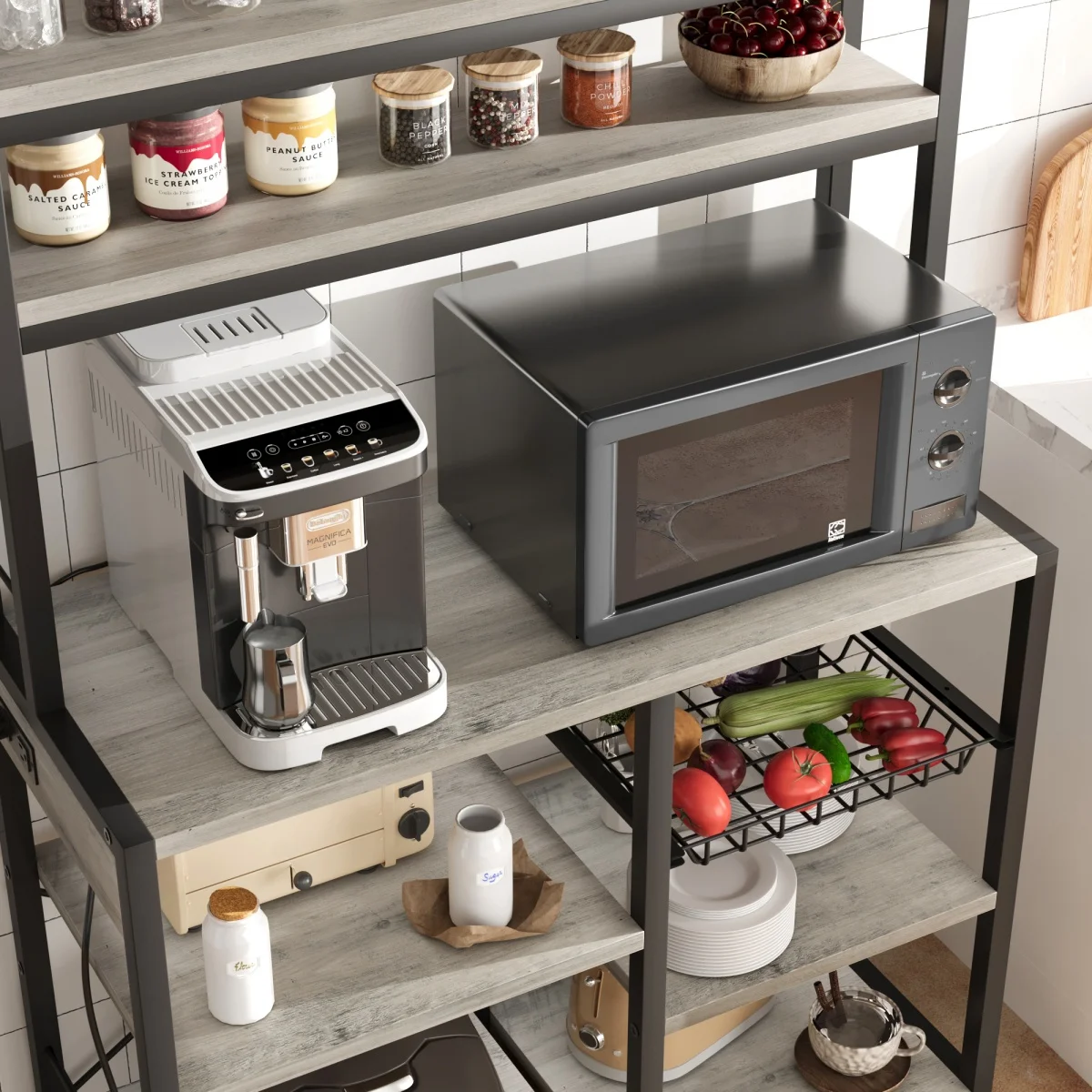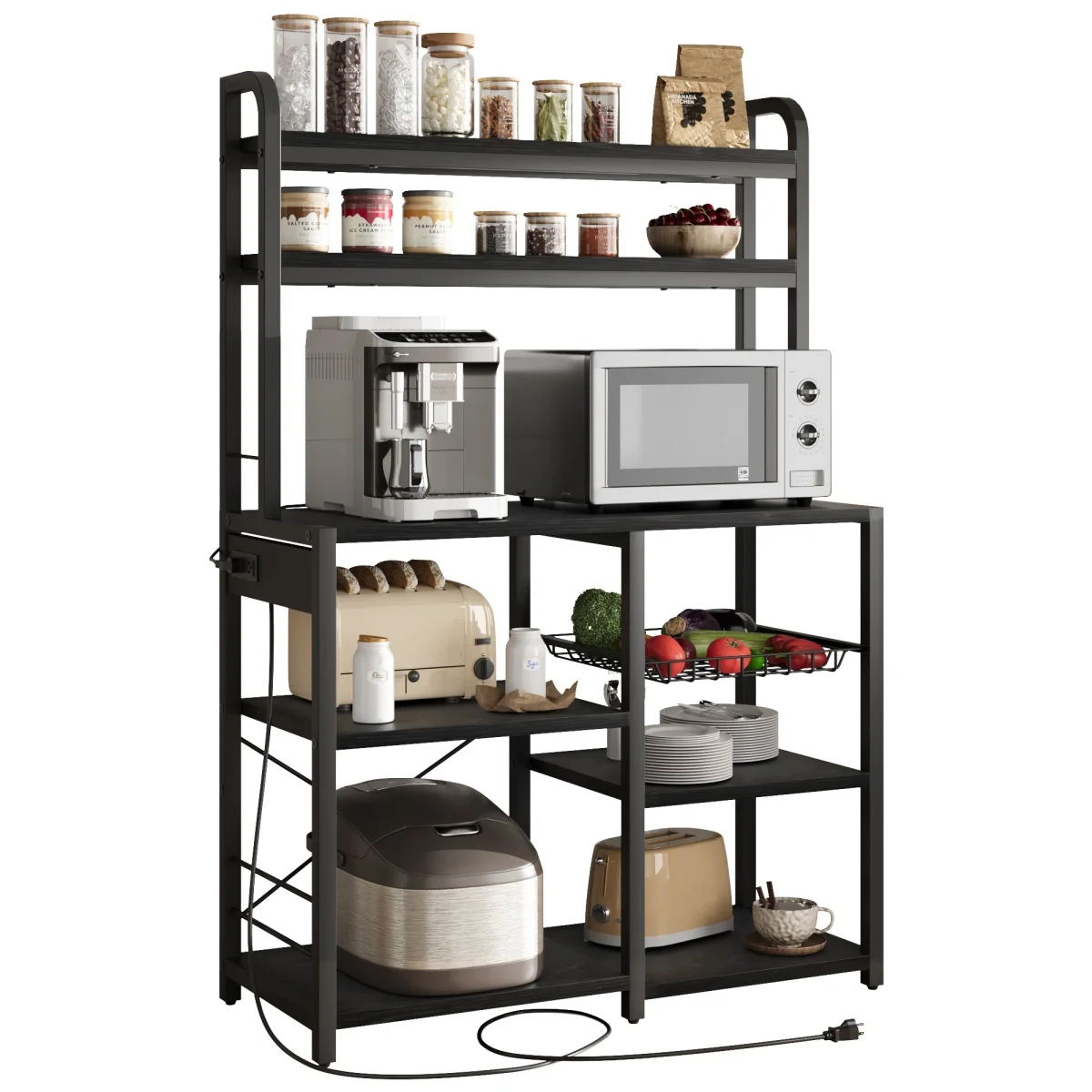 Kitchen Bakers Rack with Power Outlet Microwave Stand Coffee Bar Station Storage Shelves with Basket for Dining/Living Room