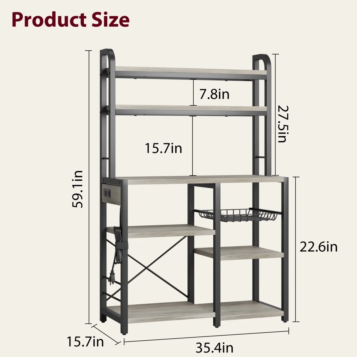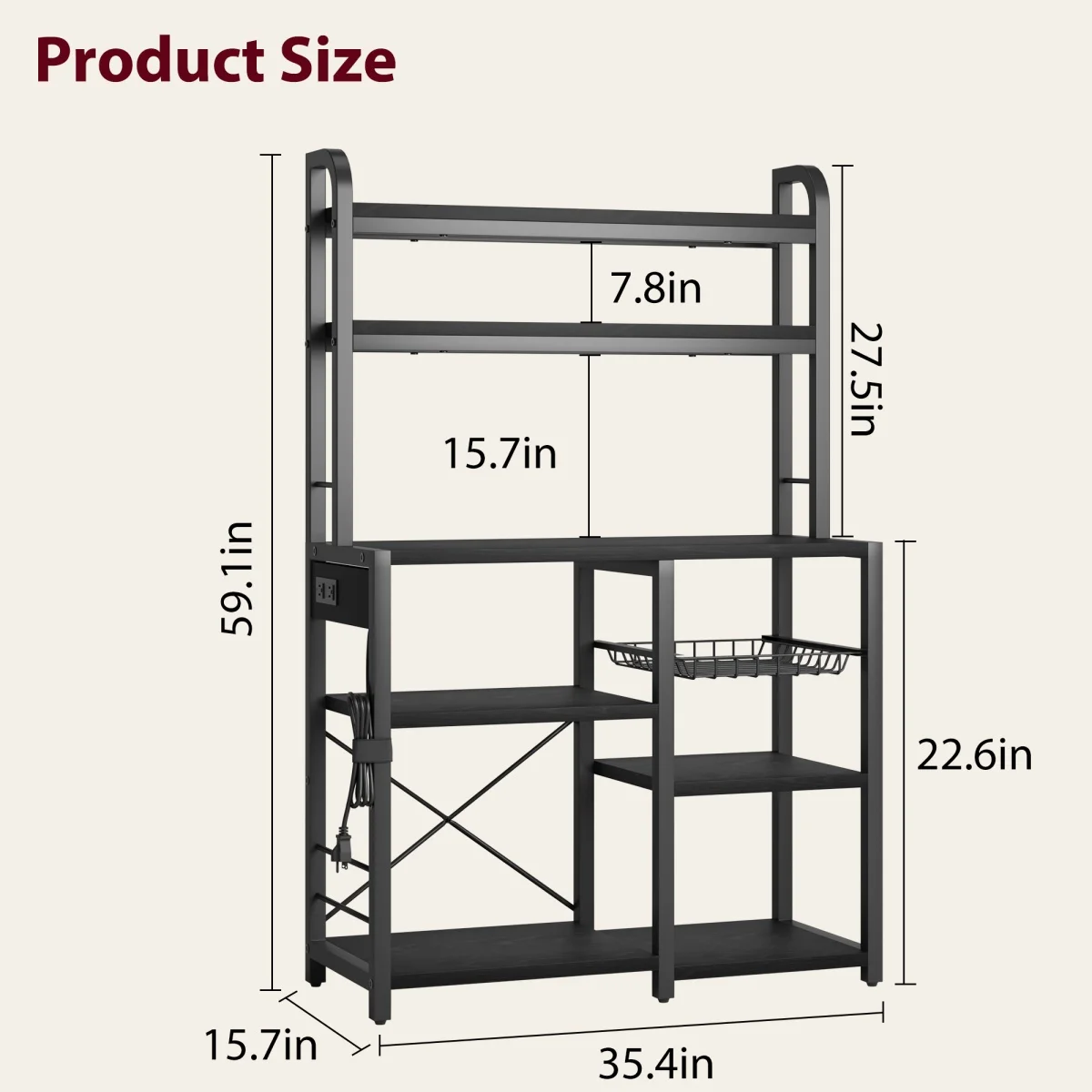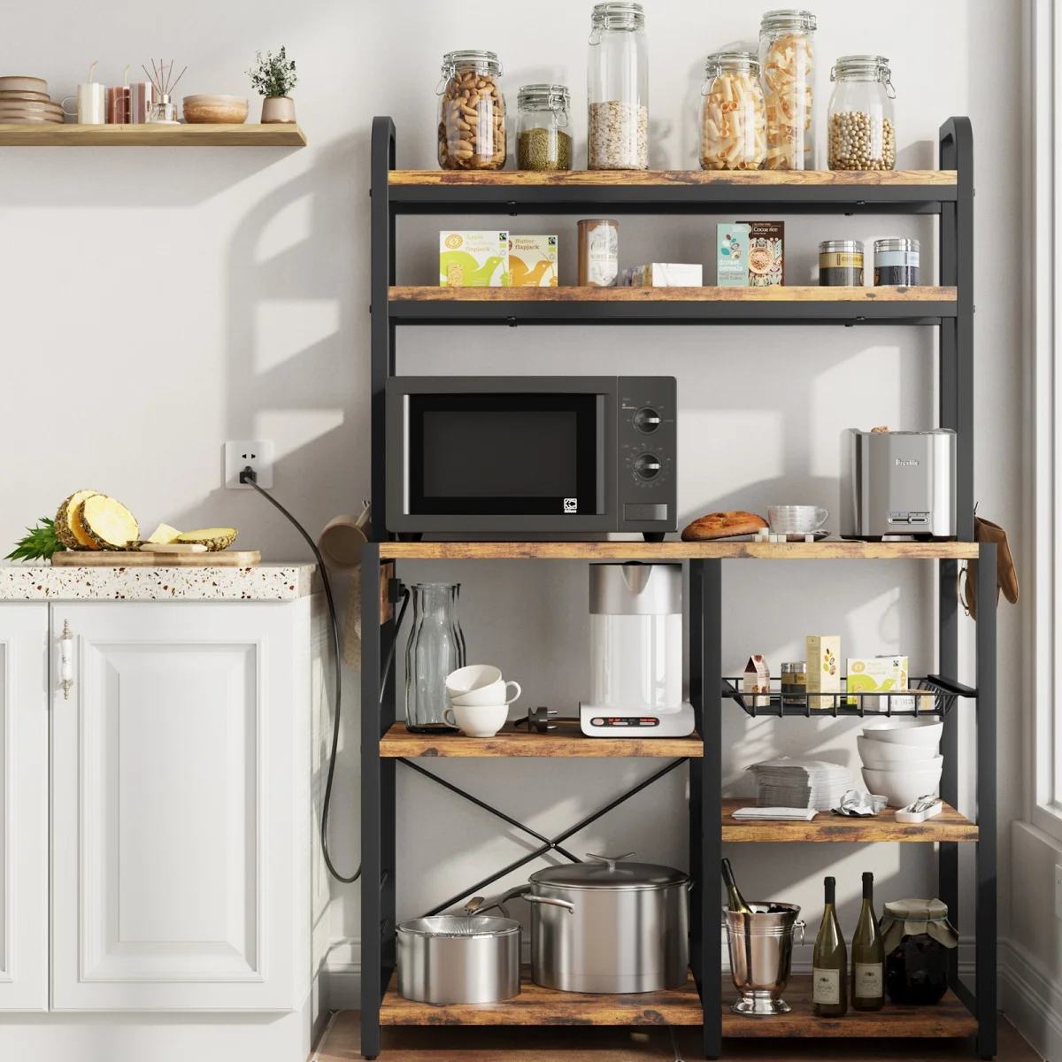 Kitchen Bakers Rack with Power Outlet Microwave Stand Coffee Bar Station Storage Shelves with Basket for Dining/Living Room