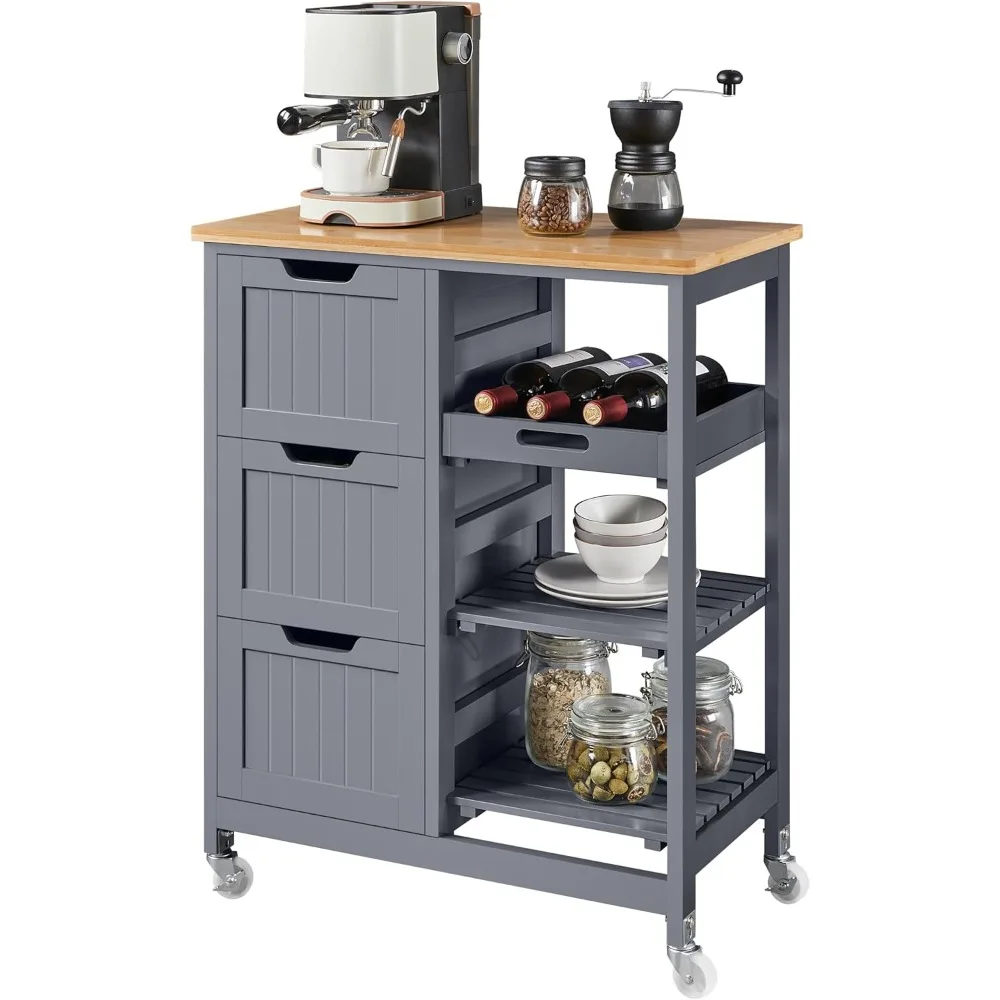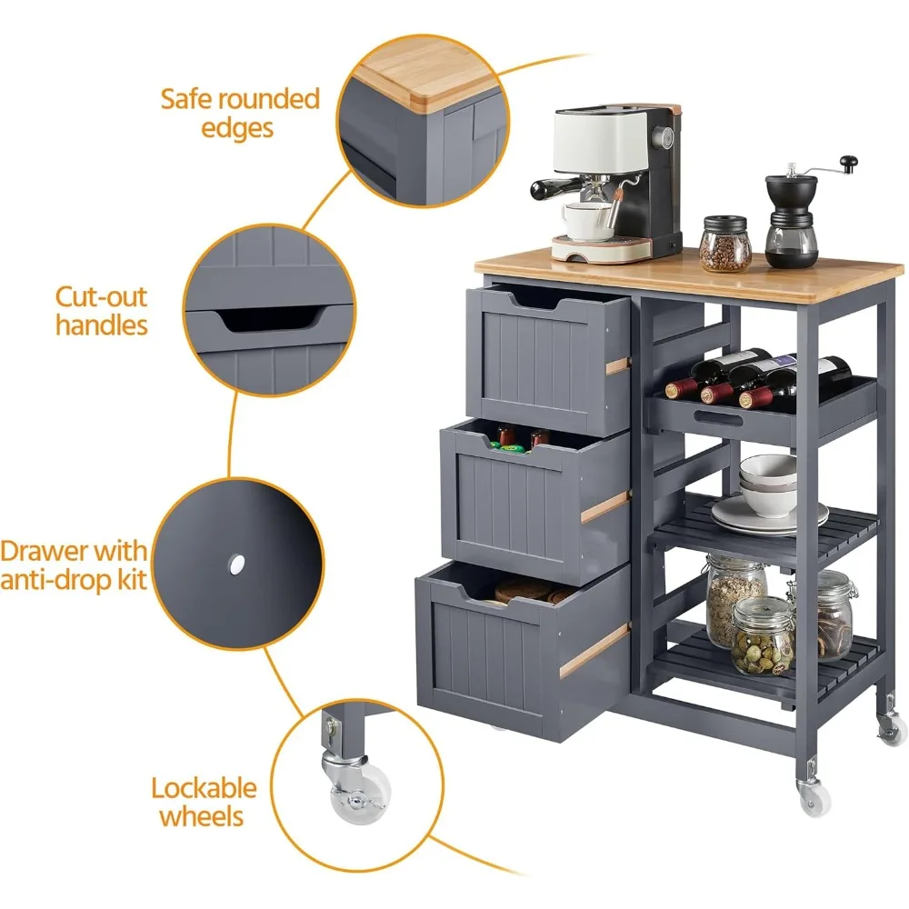 Kitchen Island Cart on Wheels with Storage, Rolling Bar Cart with Solid Wood Top and 3 Drawers, 3 Removable Shelves
