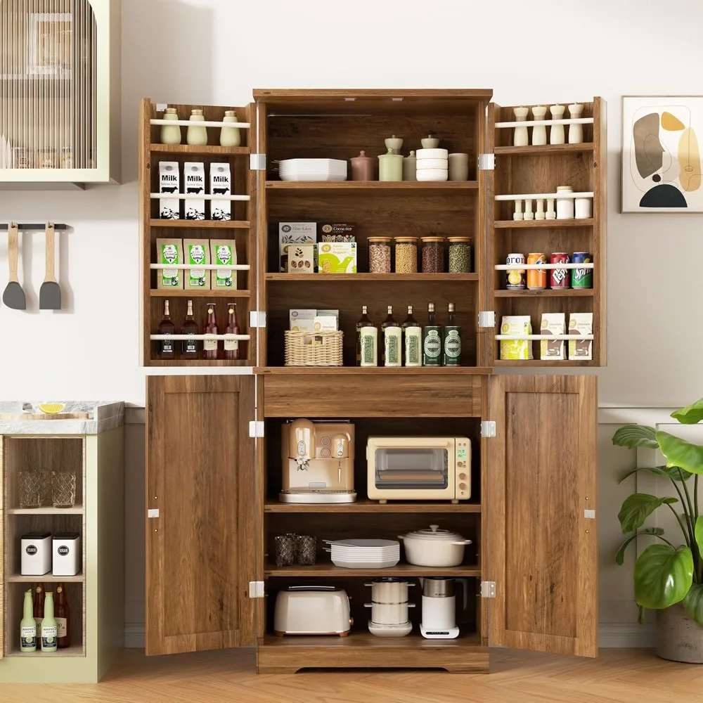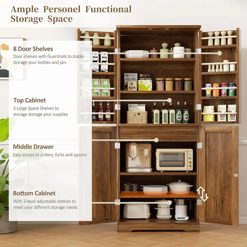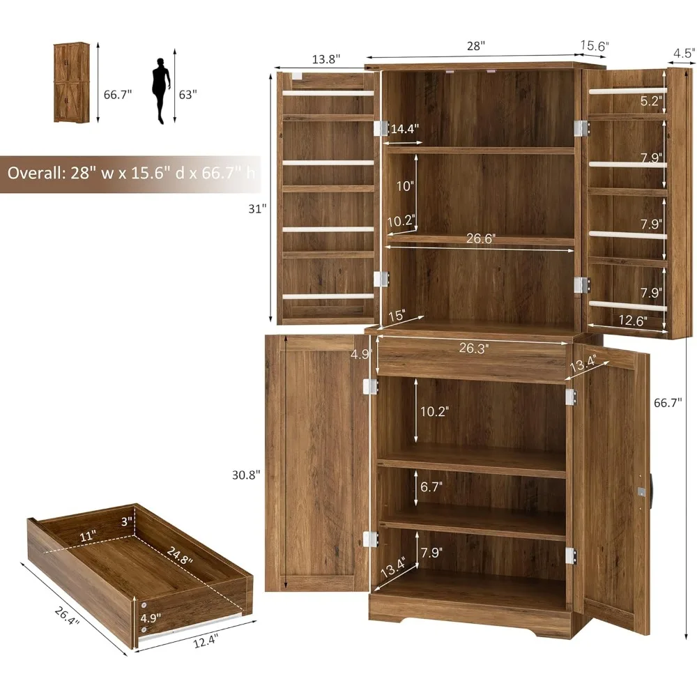 - Enrich Your Storage Space: This Pantry offers versatile storage solutions. Featuring 6 internal shelves and 1 of them can be customized in 3 different height, ideal for oranizing dishes and kitchen appliances. While the four side shelves on each door provide additional space for beverages, condiments, and small jars. A spacious drawer is equiped for utensils