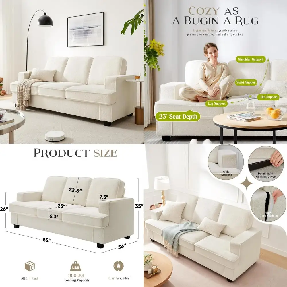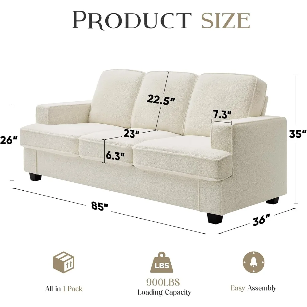 Certainly! Here's a rewritten product description based on the provided information: --- **Product Description:** Introducing our luxurious sofa, designed for comfort and style. With a depth of 21.6 inches, it features a triple-layer foam cushion and pocket springs, making it ideal for movie nights, taking naps, or spending time with friends. A tip for optimal comfort: after unpacking, fluff the cushion to restore its original shape. Our sofa is wrapped in plush teddy fleece fabric, providing a soft touch and resisting stains and pet claws with ease. The high-density cushion combines layers of foam with flexible springs for orthopedic support, while the back cushions are filled with sponge for added comfort. Its sleek design is both modern and durable, ensuring no sagging and maintaining its quality over time. This sofa bed is a space chameleon, fitting perfectly into any decor, from a studio to a mansion. Its versatile design and elegant style enhance any room, providing a cozy and inviting space for socializing or relaxing. Enjoy the warmth and serenity it brings to your home. Built for durability, our sectional couch has a robust wood frame and high-quality springs, capable of supporting up to 900 lbs. The three-seat sofa is reinforced with an iron main frame for added support, stability, and longevity. The solid wood legs are equipped with protective pads to prevent damage to your floor or carpet. The covers for the armrests, back, and seat cushions are detachable and machine washable, making cleaning and maintenance a breeze. Alternatively, a sofa cleaner can be used for easy upkeep. Assembly is straightforward, taking approximately 10 minutes with the included instruction manual and tools. Our professional after-sales team is always available to assist you with any questions or concerns. --- This description maintains the original meaning while avoiding special symbols and ensuring the language is clear and accessible.