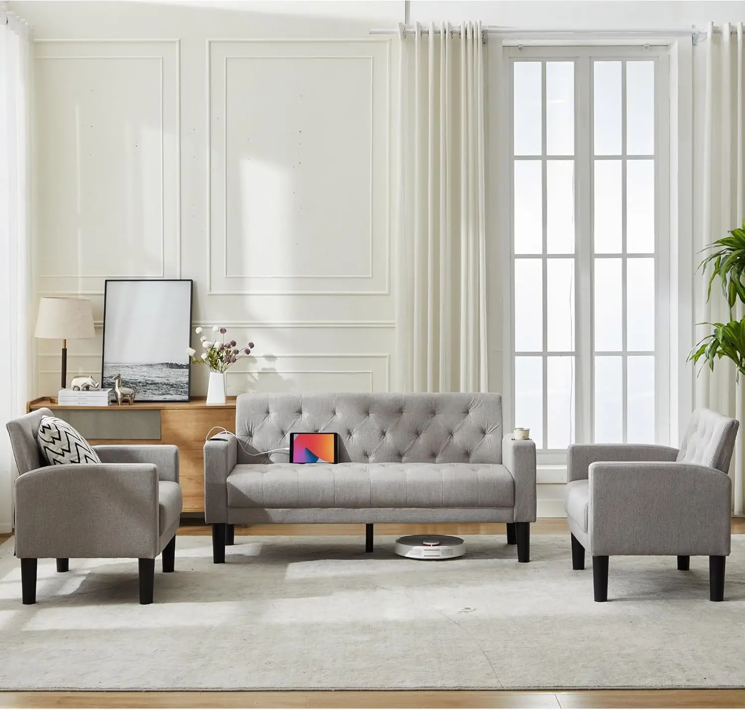 - 【COMFORTABLE USB LIVING ROOM FURNITURE This light gray mid-century modern sofa set from us offers maximum comfort and technology. The breathable fabric fabric is soft to the touch, with 2 convenient cup holder feature and charging function. It's perfect for lounging in front of the TV or a roaring fire.