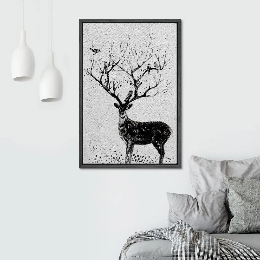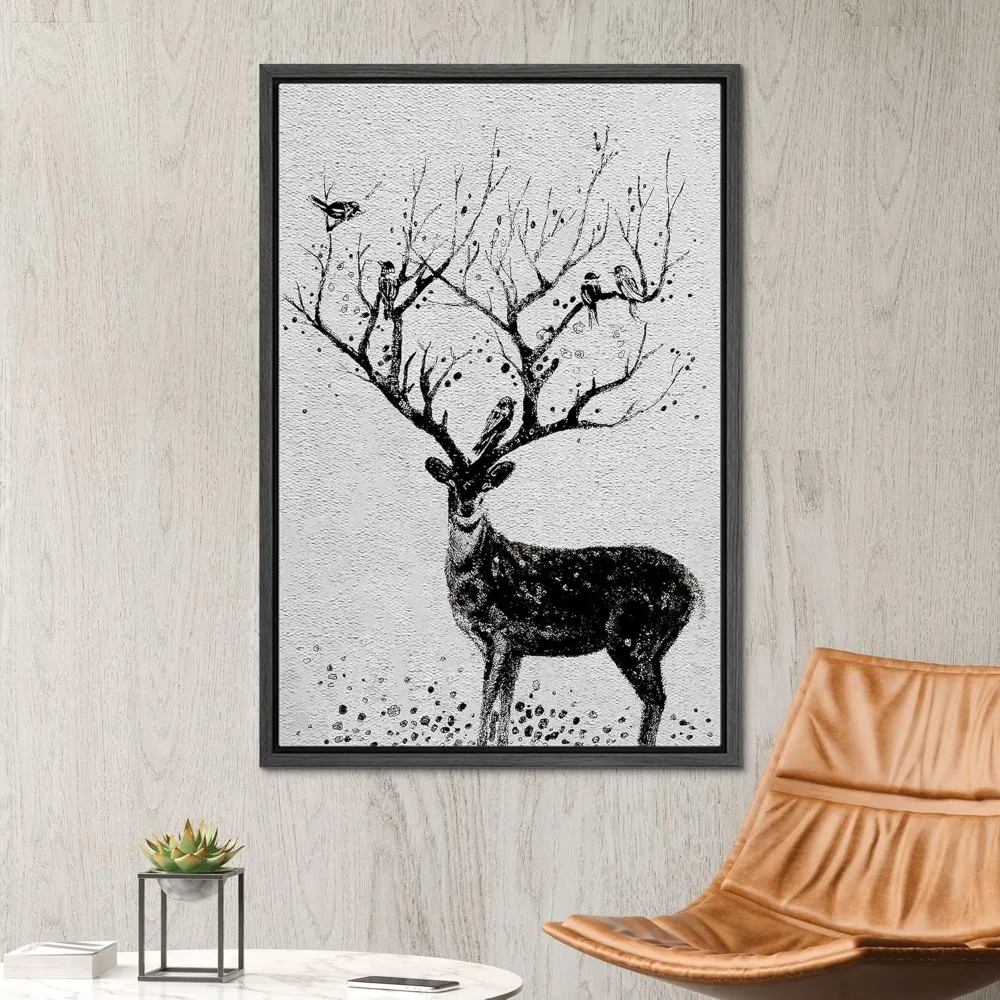 Modern Chic Wall Art: Framed Black and White Deer Canvas with Birds on Antlers Wildlife Scene