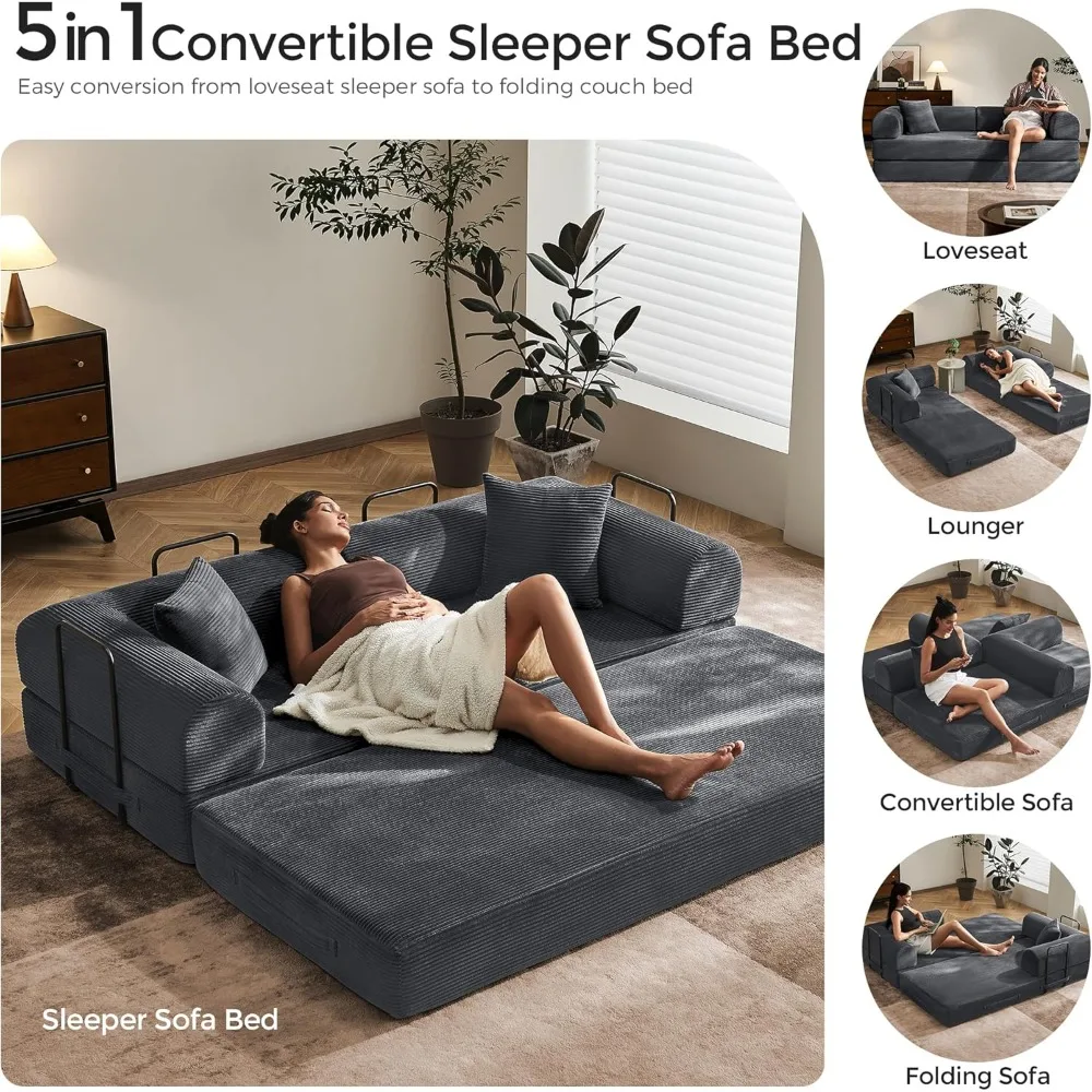 Introducing the 5-in-1 Convertible Modular Sofa, a versatile piece of furniture designed to maximize space and creativity. This innovative sofa bed allows you to transform your living area into a comfortable seating arrangement or a spacious sleeping solution with ease. With removable armrests, backrest, and base, you can configure it into a 3-Seat Sofa, Oversized Sleeper Bed, Lounge Recliner, Game Chair, or a Custom Sectional to suit your needs, perfect for living rooms, dorms, and game rooms. Featuring an Oversized Safety & Stability design, this sofa is built with a reinforced steel frame and non-slip cushions that provide a secure grip on hardwood, tile, or carpet flooring. In sofa mode, it measures 79"L×35"W×26"H, offering optimal back support, while in bed mode, it expands to 79"L×70"W for a generous sleeping space. The Ergonomic Comfort Design ensures that the angled backrest eases back strain and comes with two supportive pillows for waist alignment. The high-density sponge used in the construction retains its shape longer than regular foam, guaranteeing enduring comfort. The Corduroy Sleeper Sofa Defense fabric is fine-striped and resistant to spills, pet claws, and everyday wear and tear. This soft yet durable material is easy to clean; simply dab with mild soap and air dry to maintain its plush appearance. Enjoy the convenience of No Assembly required and Simplified Care. Unbox, let it expand for 72 hours, and start enjoying. The non-slip base keeps it in place, and for wrinkle care, hold a steam iron 3" above the fabric without direct contact.