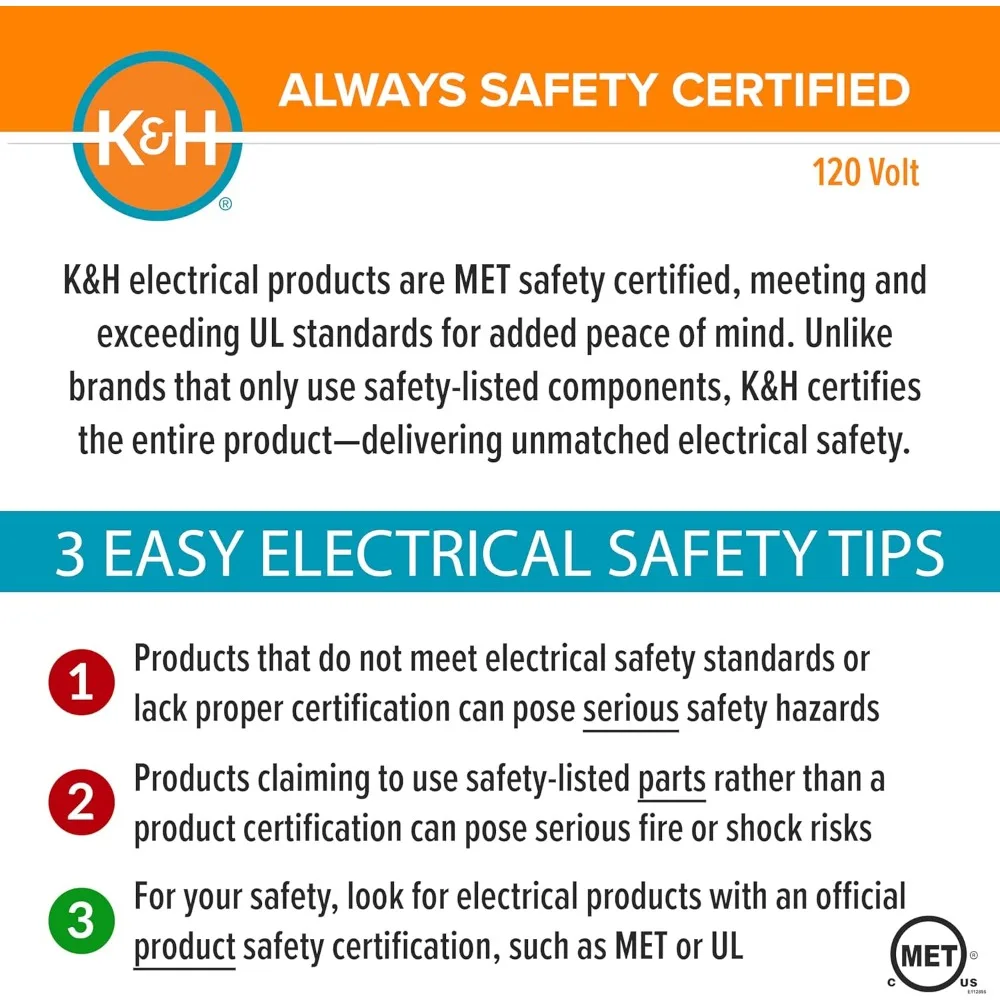 - SAFETY: K&H heated pet beds are tested & certified by MET Labs and exceeds USA/CA electrical safety standards; K&H doesn't just use safety listed parts, we safety certify the entire product - For indoor household use with 110/120 volt electrical current only