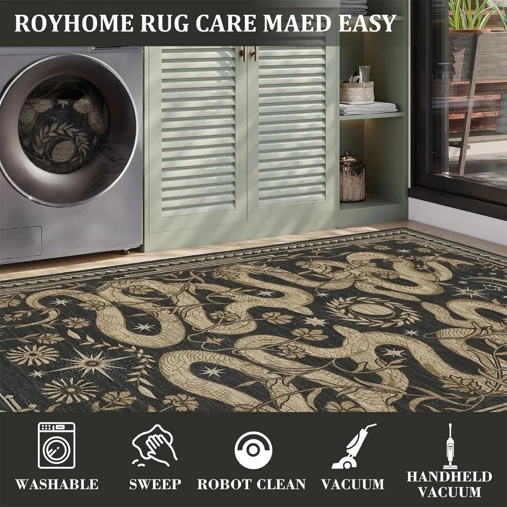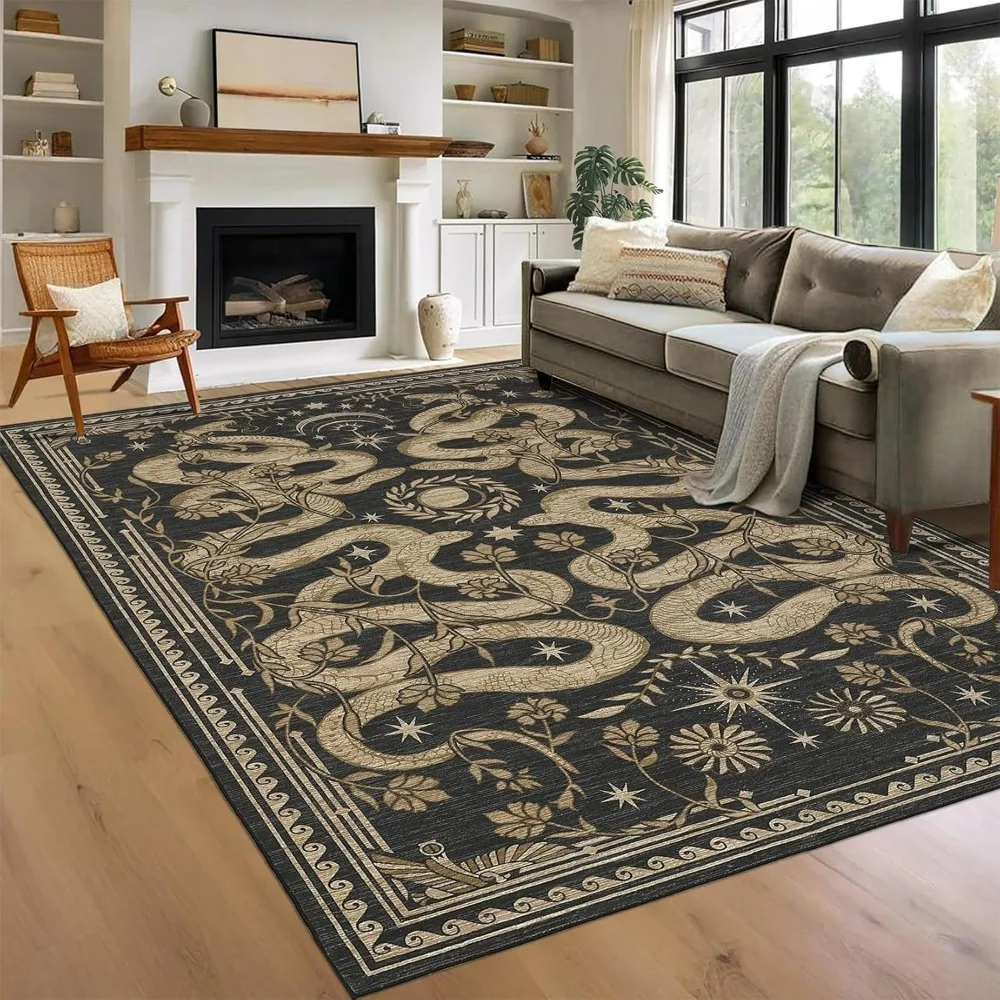 - 【Snakes and floral design】Featuring bold and stylized snakes intertwining with intricate forest floral elements, this design is complemented by a simple yet elegant decorative border. Variants of beiges ,green, and golds stand out beautifully against a deep black charcoal ground, creating a striking contrast. Water-resistant, stain-resistant, and machine-washable. Rug colors may vary slightly according to your device and the lighting in your space