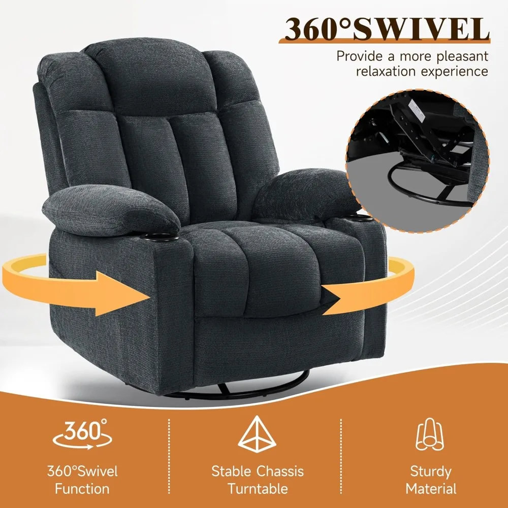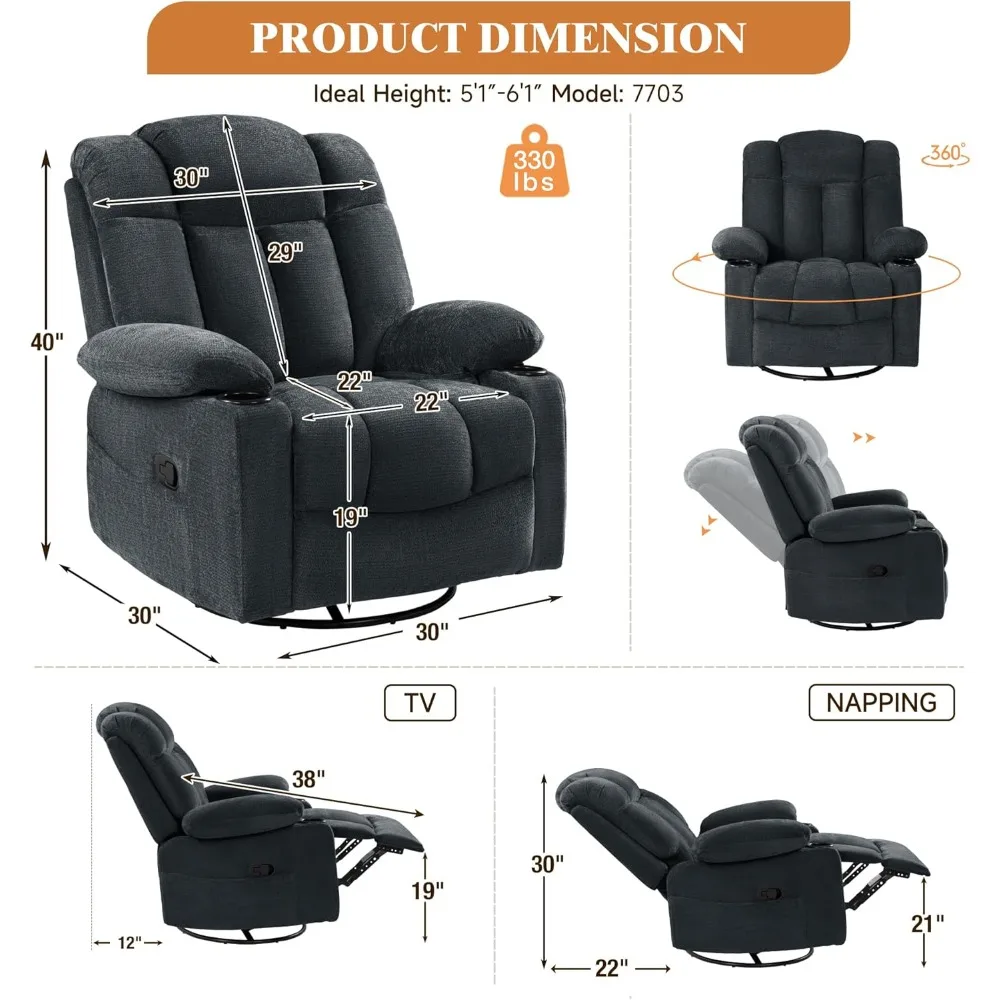 - 【Convenience Meets Style】 Designed for modern homes, this Swivel Rocker Recliner Chair includes dual cup holders, side storage, and quick Manual assembly. Ideal for Living Room, Nursery, or office use, it’s a blend of comfort, function, and contemporary style—perfect for reading, nursing, or simply relaxing.