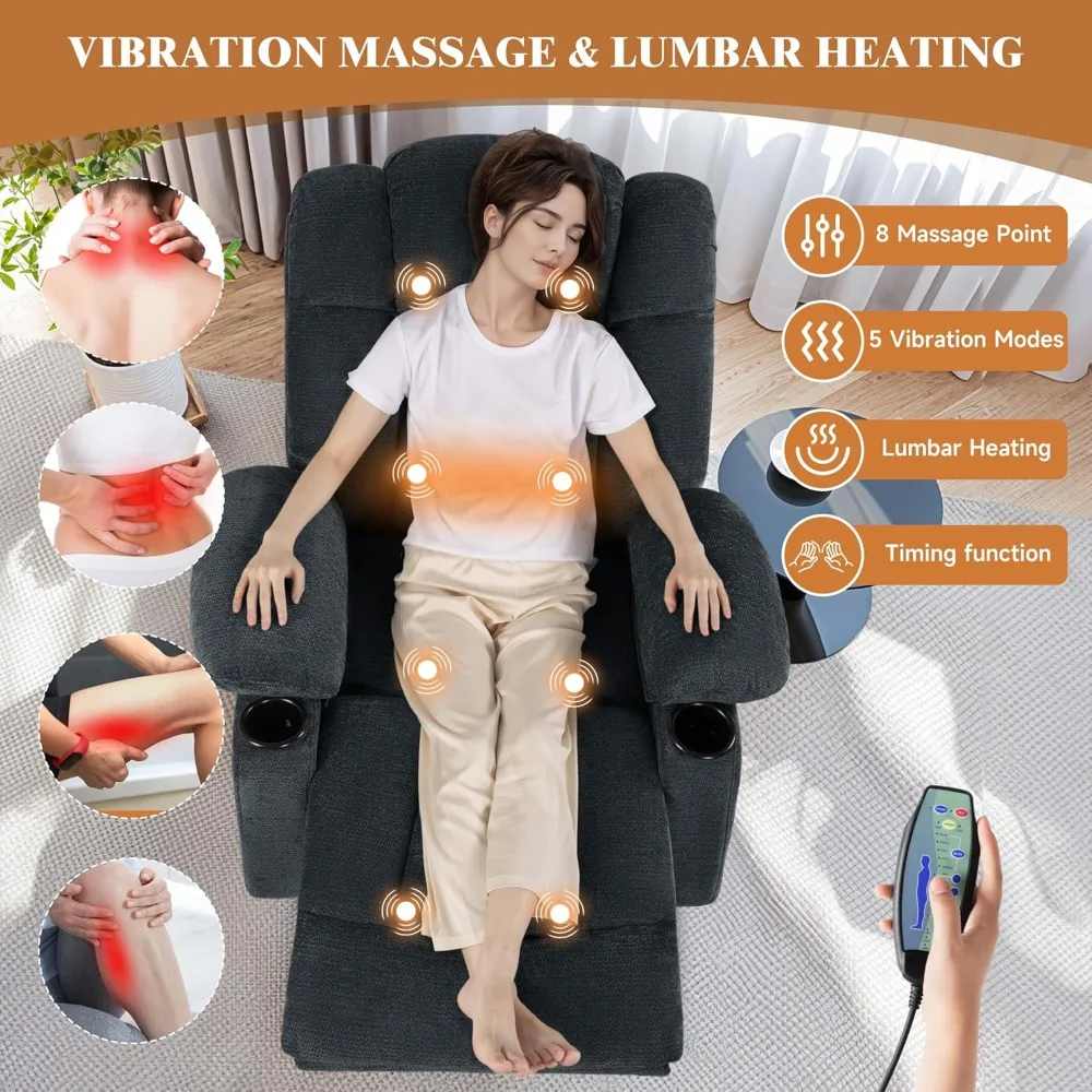 - 【Massage & Heat for Deep Relaxation】 Enjoy 8-point Massage and soothing Heat therapy designed to relieve back, lumbar, thigh, and leg fatigue. Five Vibration modes and two intensity levels help melt away daily stress. Controlled via a handy remote, this Recliner delivers personalized spa-like comfort right at home.